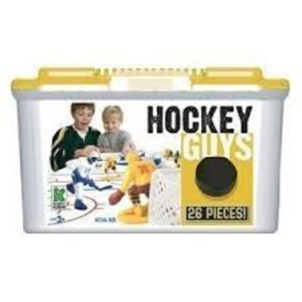 "Complete set of sports action figures for kids imaginary play. NHL Licensed with team Logos. 2 full teams including 14 2 1/2"" players; 1 referee 2 goals 1"" puck. 10 rink wall pieces that slide together to form a full rink; Instruction booklet with basic rules and strategy. 26"" x 18"" shiny slick plastic mat that resembles ""ice"" surface. 10"" x 6"" x 5"" stackable container with attached lid and handle."